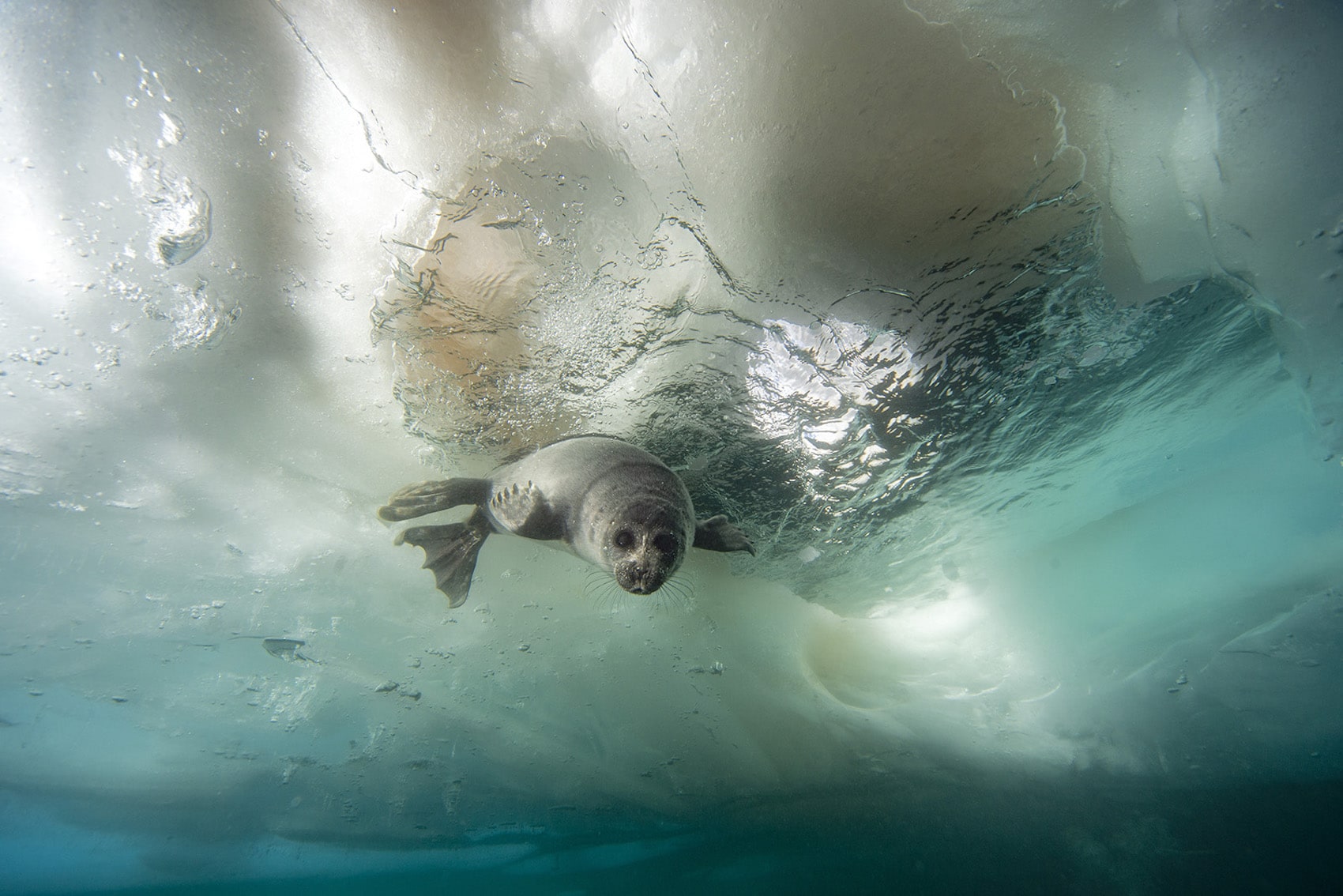 Wieder werden wir angestupst. Die Robbe scheint schnell zu lernen, denn sie beginnt aus unserer Ausatemluft, die sich unter der Eisdecke gesammelt hat, zu atmen. Faszinierend, wie schnell das Tier lernt! So braucht sie zum Atmen gar nicht zurück zu ihrer Höhle.