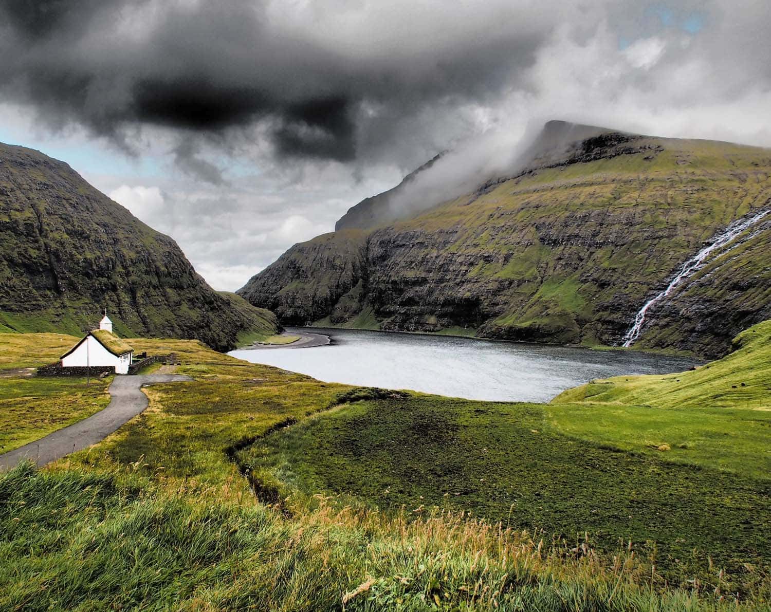 Tórshavn besteht aus bunten, teils grasgedeckten Häusern, einem Hafen und einer langen Straße, die vom Hafen wegführt. Auf nach Kirkjubøur – nordischer Kaffeeklatsch. Diese Straße führt uns nach Argír. Wie schon auf dem Weg nach Tórshavn in der Früh zeigt sich die Insel in voller Pracht. Spektakuläre Steilkliffs, Fjorde und hohe Berge. Dazwischen Täler wie aus einer Feensaga entsprungen mit immer verschiedenen Anordnungen von Fels, Stein und saftigem Grün – mal umhüllt von Nebel, mal durchzogen von Wasserfällen. Als hätte der Schöpfer zentnerschwere Findlinge samt grüner Farbe über die Hänge geschüttet, die ungehindert durch fehlende Vegetation ins Tal gekullert sind. Unser Ziel: das drei Stunden entfernte Kirkjubøur, wo uns Farmer Jóannes Patursson zum Kaffee erwartet.