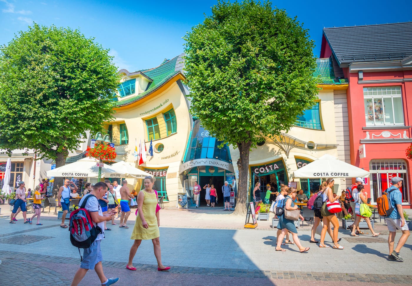 Auf Entdeckungstour: Die »Monciak« ist eine charmante Fußgängerzone. Schlendern absolut erwünscht! Gerne gleich mit Strandtasche, denn der Weg führt direkt ans Meer. Der Weg ist zudem gesäumt von Cafés, stilvollen Restaurants und kleinen Shops. Doch die Aufmerksamkeit, insbesondere für Fotos, zieht ein einzigartiges Gebäude auf sich, das wie eine zerquetschte Bierdose aussieht und von den Einheimischen liebevoll »betrunkenes Haus« genannt wird.