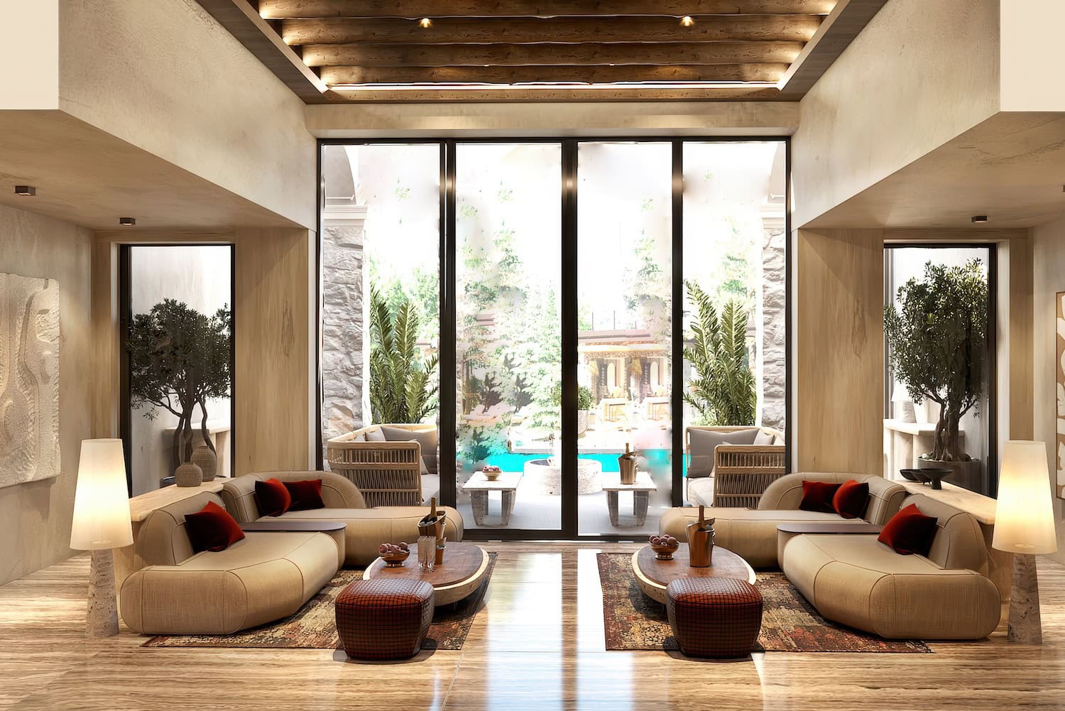 Wie schaut es aus? Die Gestaltung des Hotels ist klar und zurückhaltend. In den Villen und Suiten kommen regionale Materialien und handwerkliche Details zum Einsatz, ohne aufgesetzt zu wirken. Große Fenster öffnen den Blick in die Landschaft und sorgen insgesamt für eine ruhige, entspannte Atmosphäre mit klarem Bezug zur Umgebung.