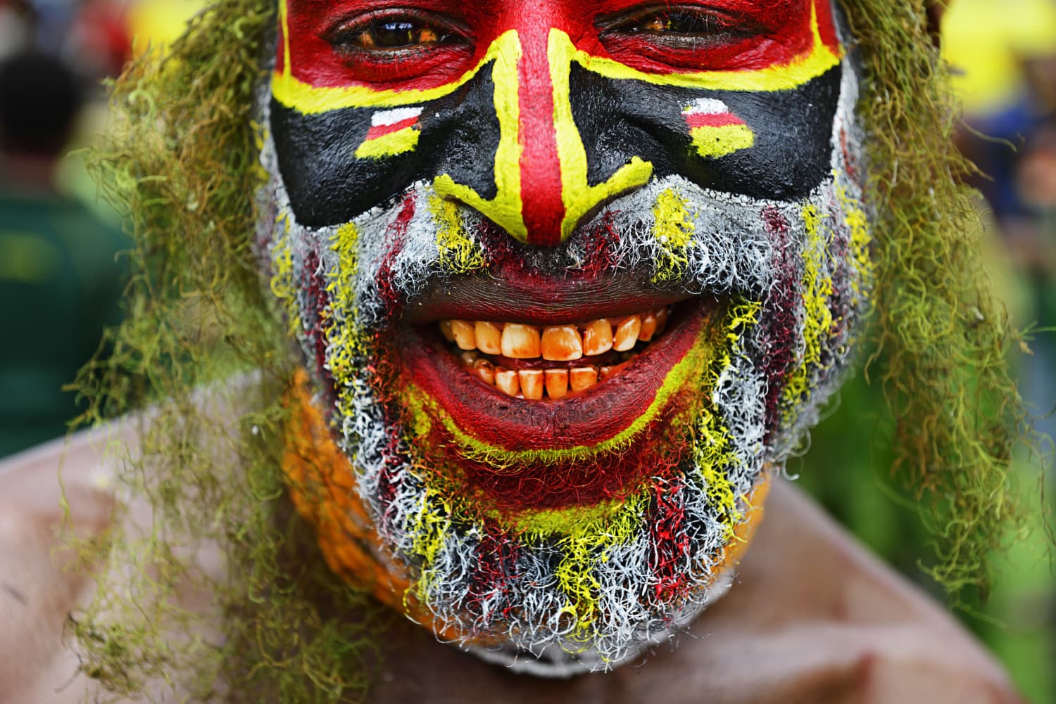 Die Damen schminken sich gegenseitig oder verwenden billige Plastikspiegel aus chinesischen Minimärkten, die den Handel im Hochland scheinbar komplett unter Kontrolle haben. Manche behelfen sich auch mit Spiegelscherben oder abgebrochenen Autospiegeln. Eine Strickmütze dient als Basis für den aufwendigen Kopfschmuck. Bunt gefasste Stoffbänder pressen giftgrüne und rosafarbene Federn vom Paradiesvogel an die Stirn. Ein nestähnlicher, aus Stroh geformter Balkenaufbau wird direkt dahinter mit zwei Holzspießen in der Mütze verankert. Er muss fortan ein voluminöses Kunstwerk aus Urwaldgräsern, Pfauenfedern und ganzen Schwingen von Greifvögeln tragen. Literweise Salatöl verleiht dem Pflanzenrock und der restlichen Haut zusätzlich Glanz. Feierlich tanzt die Gruppe in das umzäunte Rugby-Stadion. Es ist ein unglaublicher Reigen – opulent, barock, exzessiv. Über 2.000 Darsteller, Krieger, Sänger und Musikanten sorgen für eine unglaubliche Kakophonie.