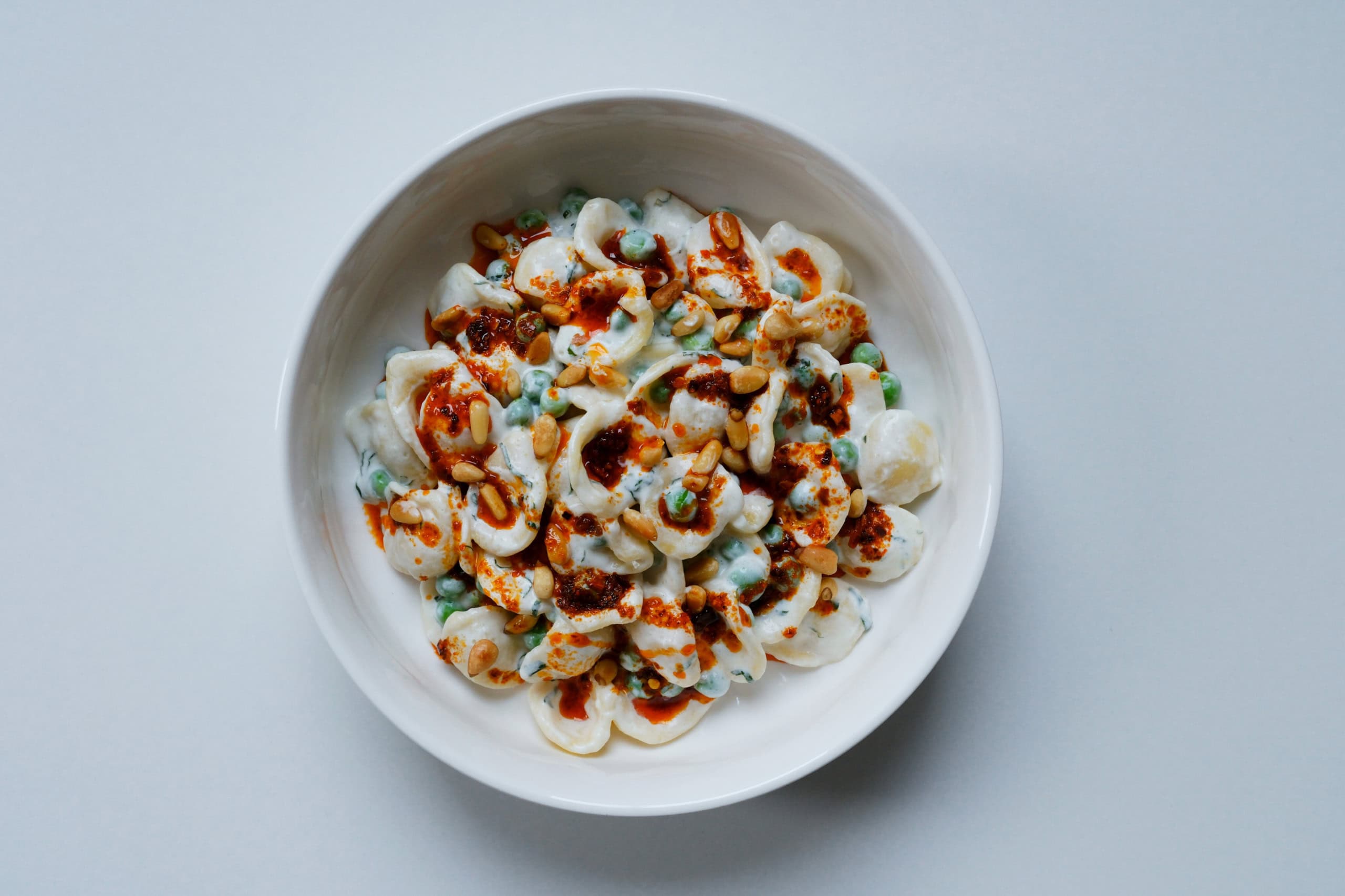 Als jemand mit italienischen Wurzeln bleibt für mich trotzdem ein Grundsatz: Nicht jede Pasta passt zu jeder Sauce. Orecchiette sind hier ideal. Ihre kleine, schalenartige Form fängt die cremige Joghurt-Minze-Sauce perfekt auf, während sich Erbsen, ein Hauch Chiliöl und geröstete Pinienkerne darin sammeln.