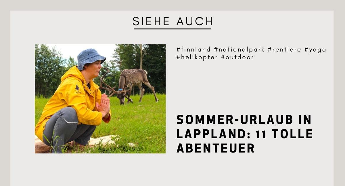 Dreieck und Krieger mit tierischer Begleitung. Auf der »Rentierfarm Kujalan« (hier geht es zur Website) gibt es Entspannung in Begleitung von sanften Rentieren beim Rentier-Yoga. Ob Anfänger oder Profi – hier kann jeder mitmachen. Ein besonderes Erlebnis gibt es bei Yoga-Positionen wie dem »herabschauenden Rentier«. Ein tierisches Vergnügen!